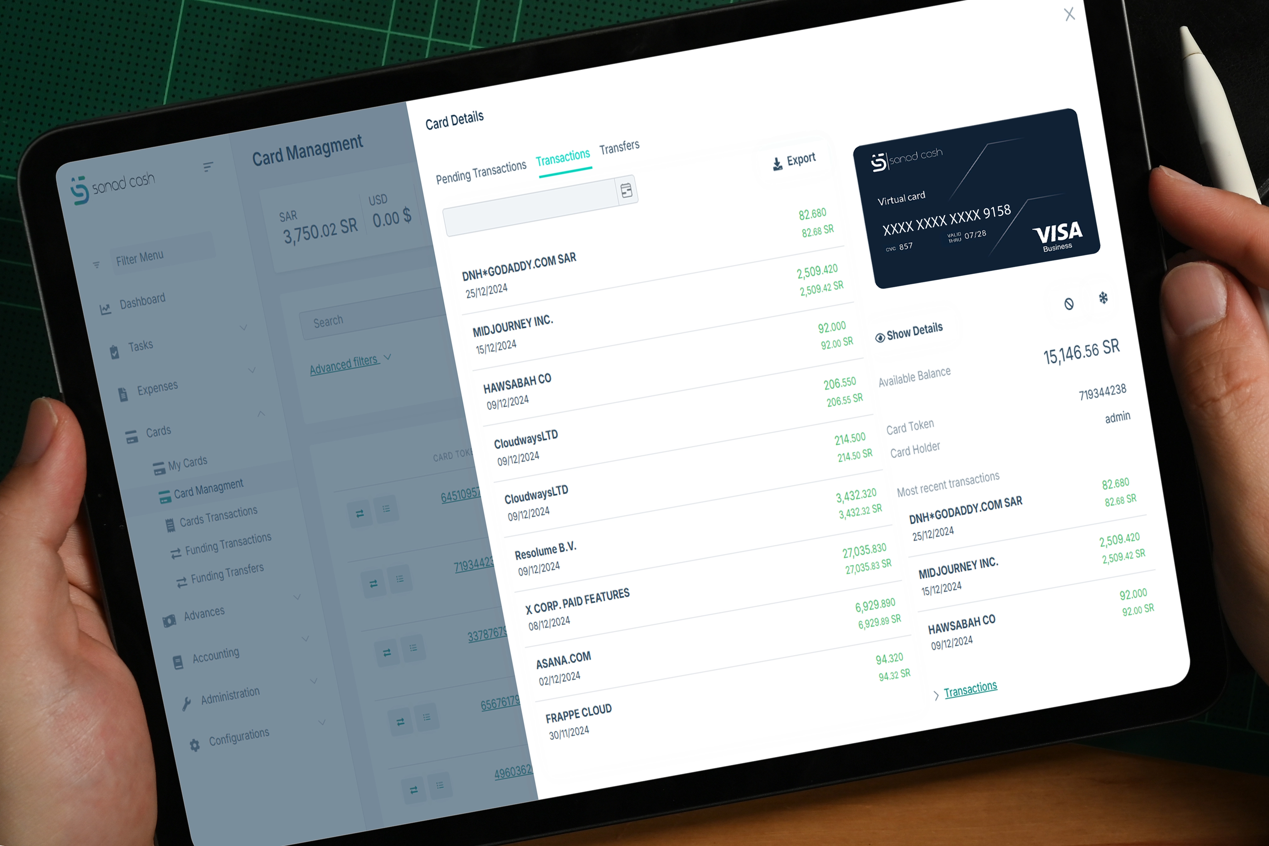 يمكنك تتبع مصاريف فريقك في الوقت الفعلي عبر منصة سند كاش، التي توفر لك رؤية كاملة للمعاملات والإيصالات وأنماط الإنفاق. ستكون لديك السيطرة الكاملة على البطاقات وسياسات الإنفاق لضمان الامتثال والشفافية.